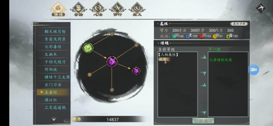 如图所示:阴属性165【阴域】,柔属性159【柔域】,阳属性153【阳域】,毒属性150【毒域】,刚属性31【淬力】
