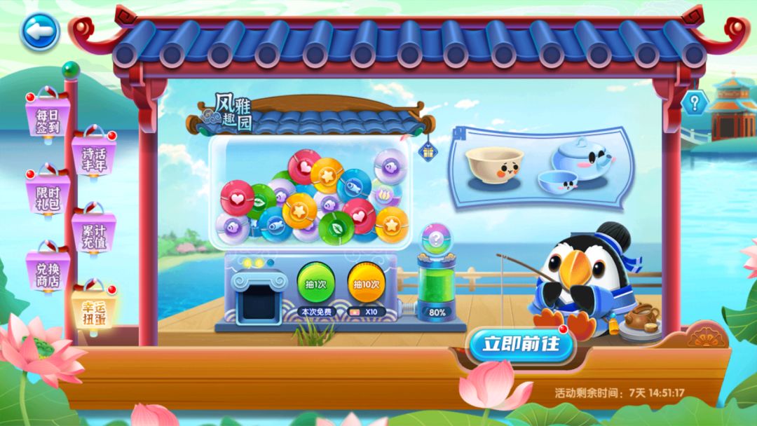 泡泡和六爪有了新衣服,企鹅老板也不甘落后,换上新装泡上一壶茶。开启了国庆活动专属的扭蛋机。