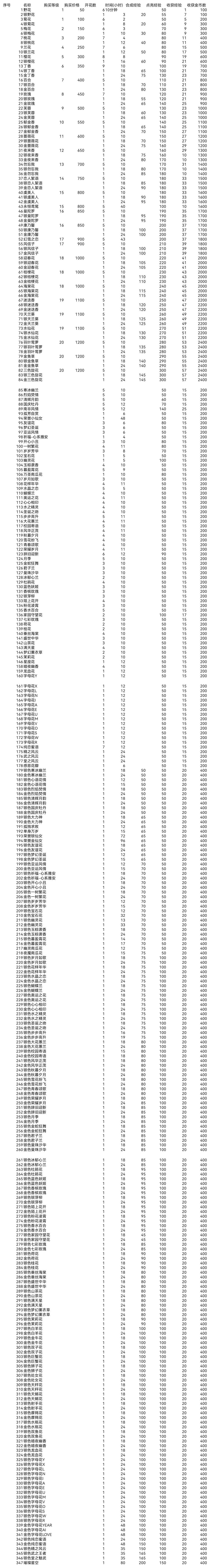 【搬运帖】花种数据表,等级表概览