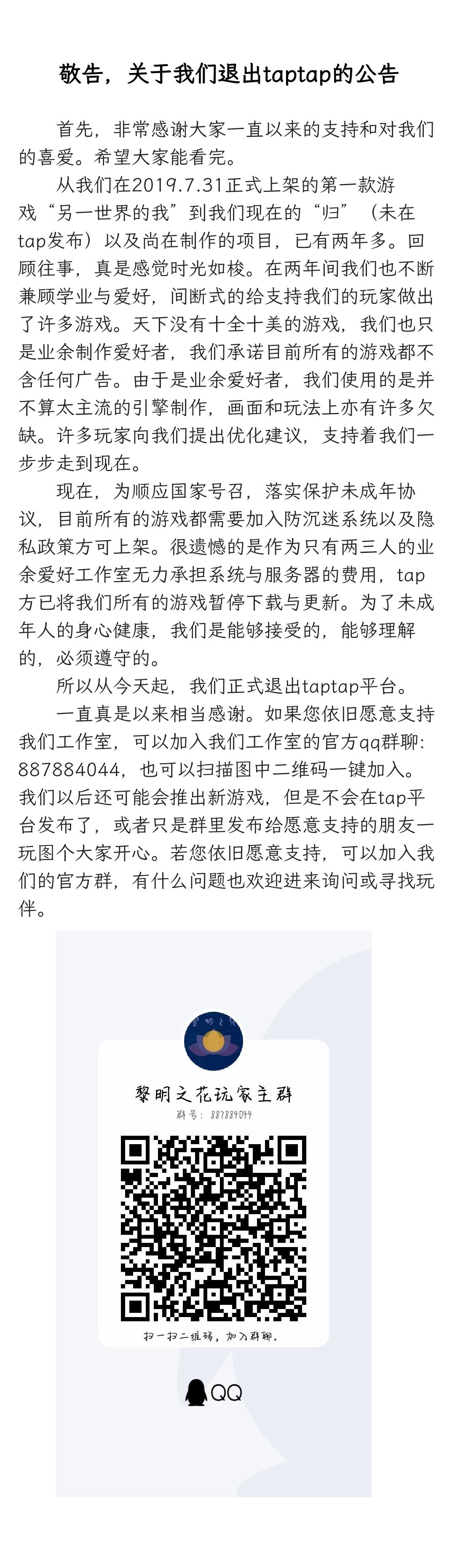 一直真是以来相当感谢。如果您依旧愿意支持我们工作室,可以加入我们工作室的官方qq群聊:887884044,也可以扫描图中二维码一键加入。我们以后还可能会推出新游戏,但是不会在tap平台发布了,或者只是群里发布给愿意支持的朋友一玩图个大家开心。若您依旧愿意支持,可以加入我们的官方群,有什么问题也欢迎进来询问或寻找玩伴。