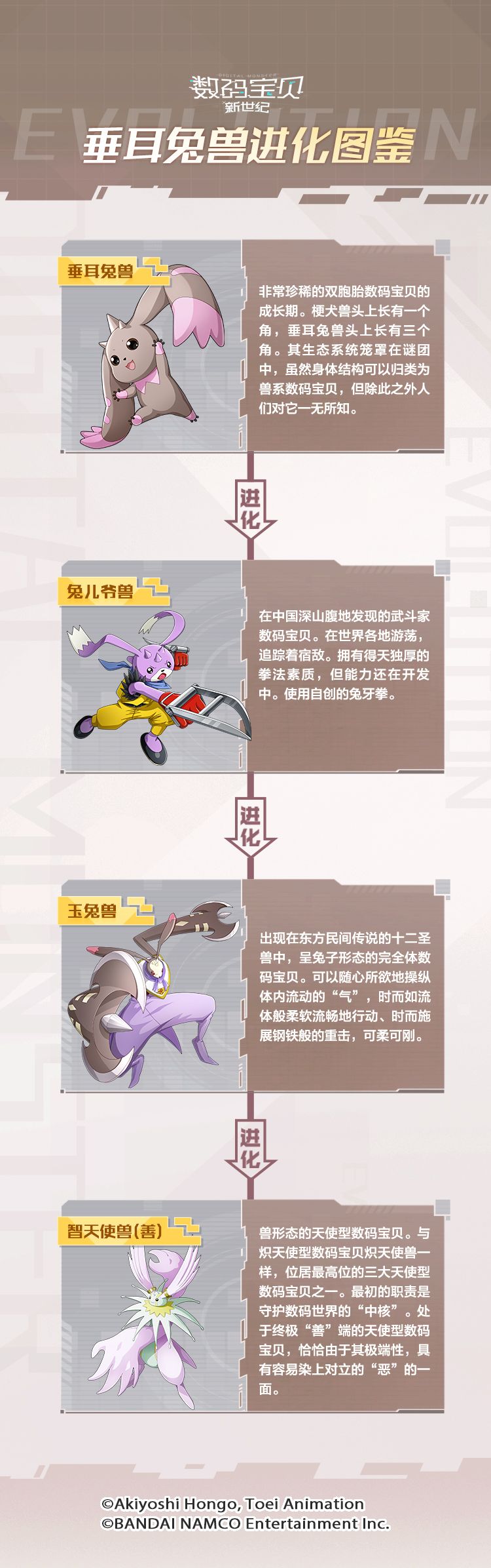 通过声优的实力演绎,完美塑造出了吴海的性格特点和生动形象,而吴海的数码宝贝搭档垂耳兔兽更是具备强悍的实力。接下来歌子就带队长们一起,了解游戏内垂耳兔兽各进化形态的背景资料叭~