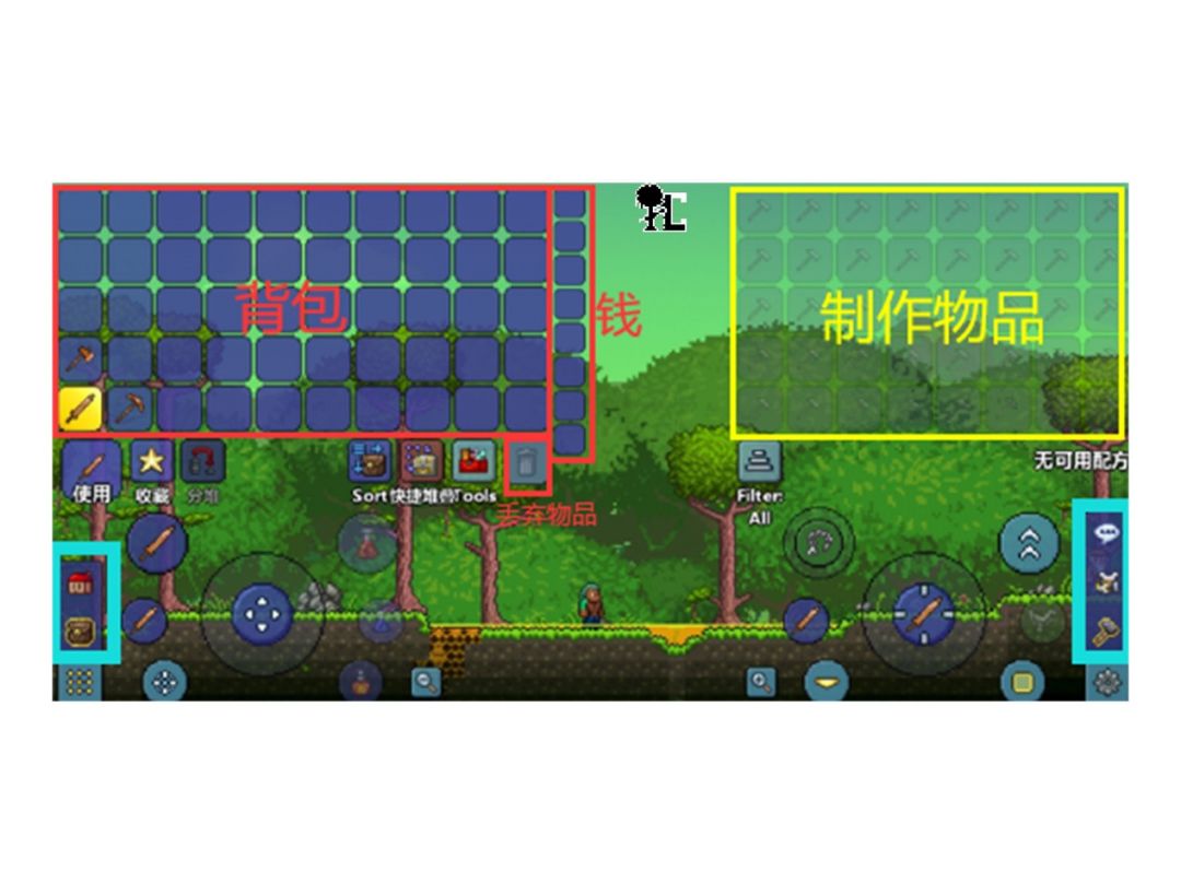 物品栏:物品放在物品栏可以快捷选择物品来使用,一般放武器、工具、垫脚方块等经常用的东西,如果角色身上有Buff,便会在物品栏右侧上方显示。