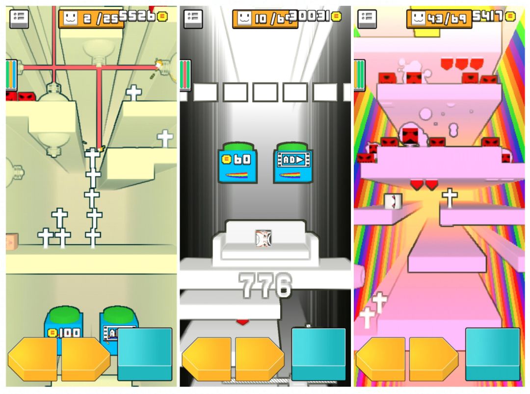 与其他横板节奏跑酷游戏不同的是,这款竖屏游戏支持主角向上飞行,在同类游戏中并不多见,支持两边同时滑翔也给游戏带来了更多的乐趣。