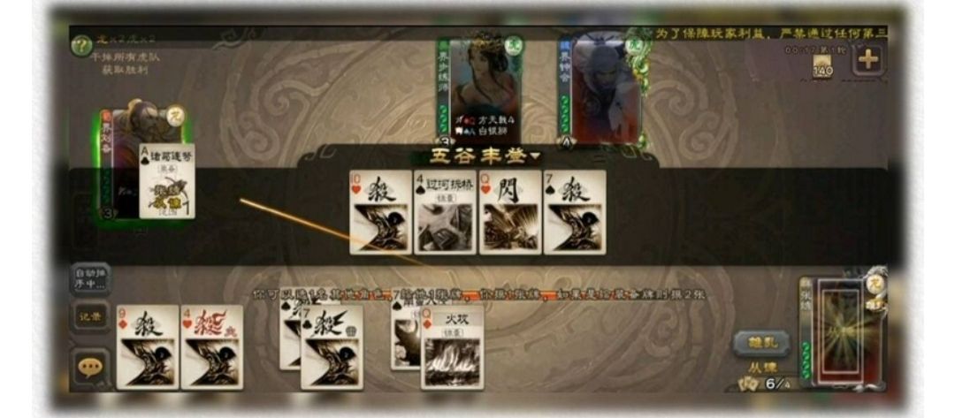 当你使用多目标锦囊时,会先触发从谏然后再结算锦囊收益,举例如上图,刘备开五谷会先触发从谏我可以先过牌然后在开始结算五谷的收益。