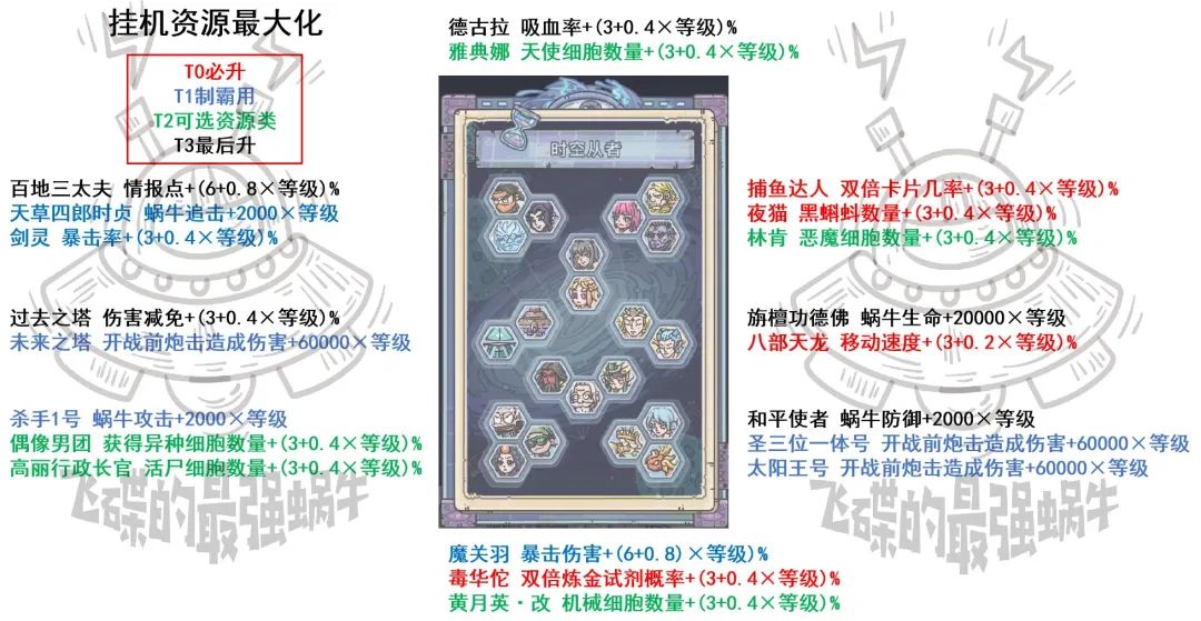 5)最后,综上所述推荐两种升级路线,蜗牛作为一个挂机游戏,必然是挂机资源路线为第一需求,所以优先推荐以挂机资源最大化为考虑的第一种。同时不排除有高属性大佬想要快速制霸地图,或者有玩家想要先通过千年虫再慢慢挂机,可以考虑第二种升级路线。