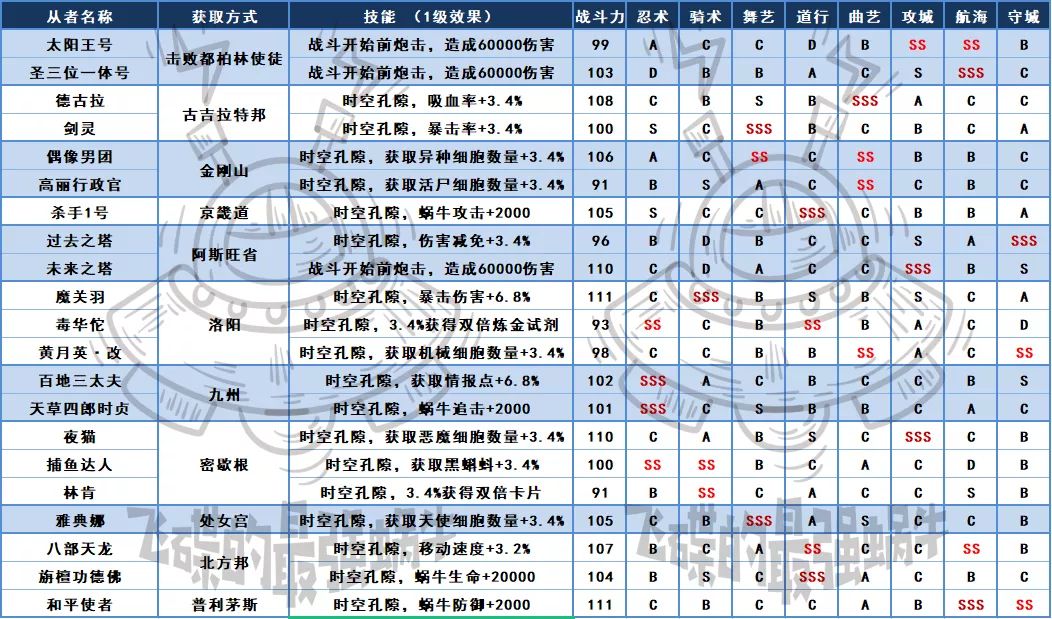 首先,对于刚开始玩时空图的玩家,还没有从者可以升级,需要打赢对应区域的地图使徒开启对应的从者,每个从者有各自的技能加成和对应8大玩法特长,如下图所示: