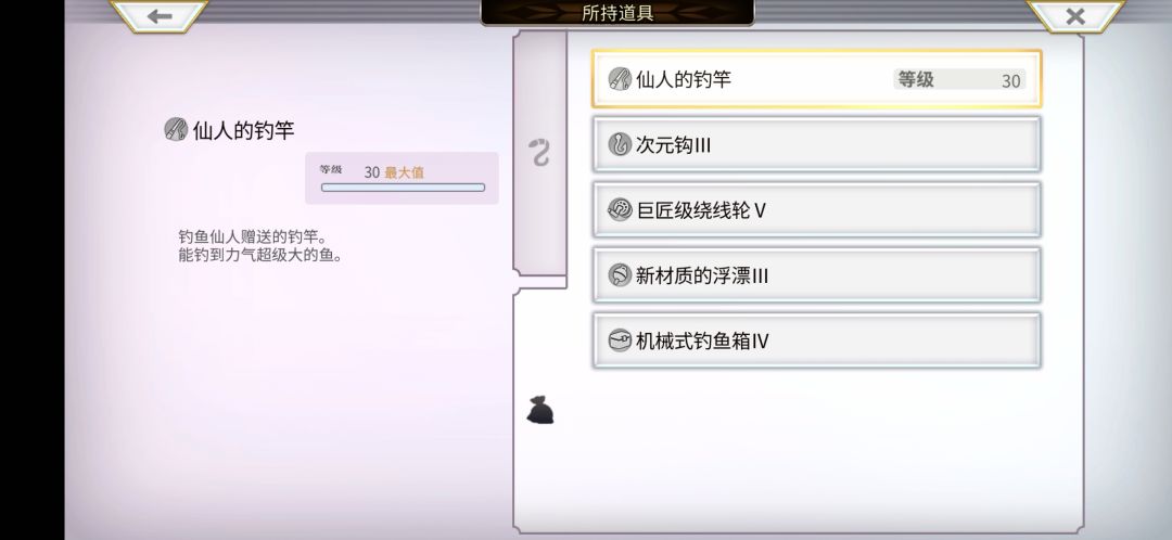 ①满级鱼竿+满级钩子+满级绕线轮+满级浮漂+满级鱼箱;