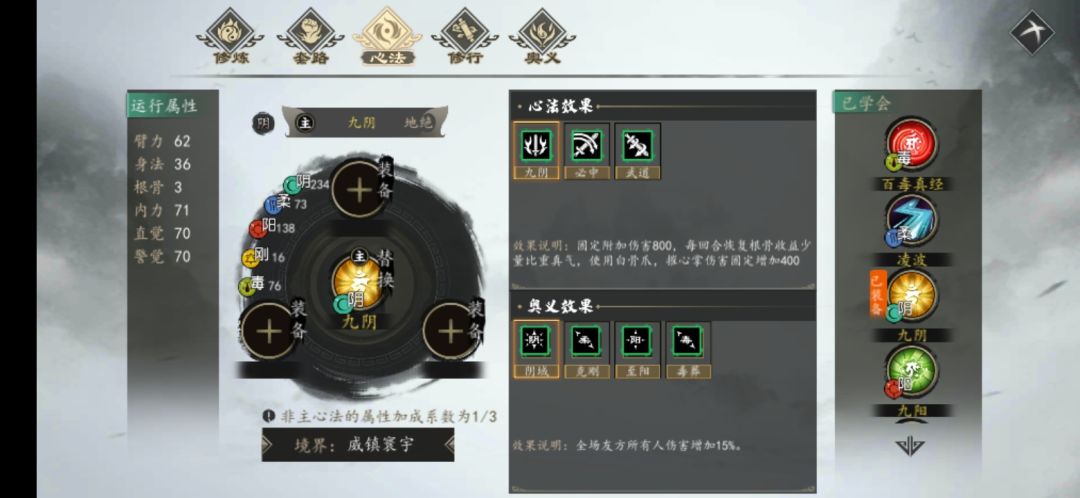 发现招式中有五个互动了《九阴》提供的贯通效果,《九阳护体》效果变成了《九阴玄功》。