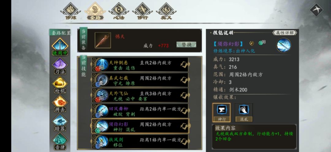 剑招《须弥幻影》镶嵌效果中,【神行】就是对己增益类,【混乱】就是对敌减益类。