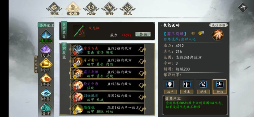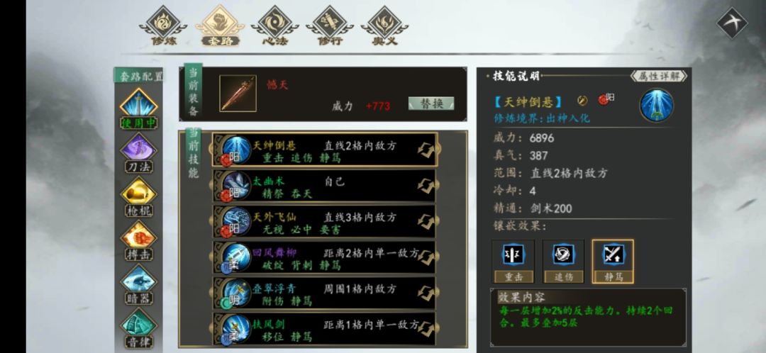 原来剑招《天绅倒悬》镶嵌效果中,多了一个《九阳护体》的效果,这就是招式互动主心法贯通效果了。