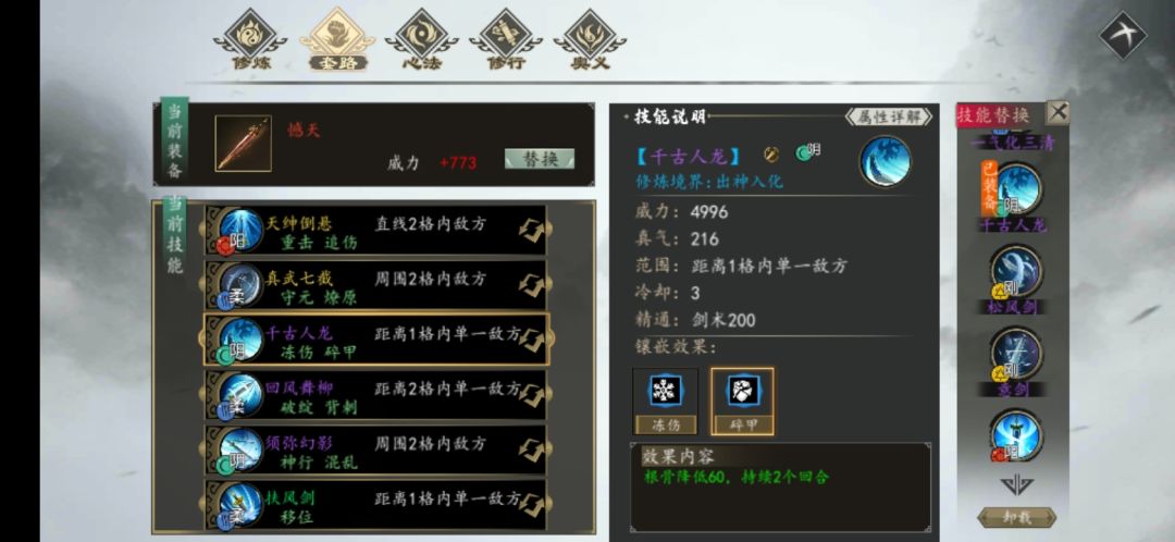 剑招《千古人龙》镶嵌效果中,【冻伤】就是永久减益类,【碎甲】就是二回合减益类。