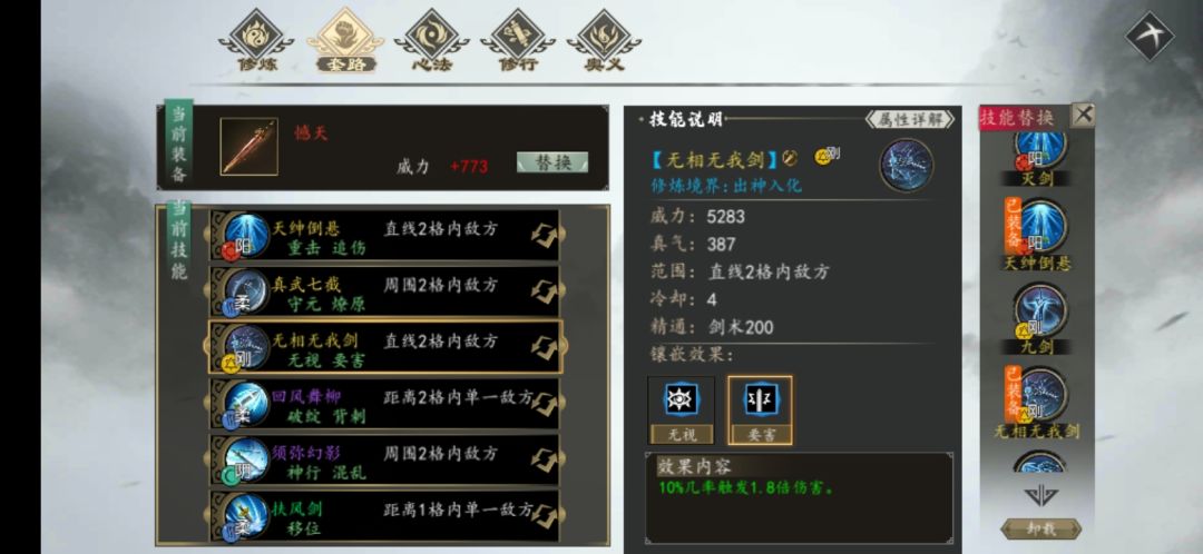 剑招《无我无相剑》镶嵌效果中,【无视】就是一回合增益类,【要害】就是永久增益类