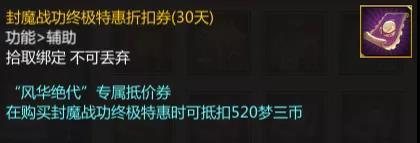 同时也不要忘记了,礼包中还包含了不同的封魔战功特惠折扣券,当大家购买战功特惠时,能够抵扣不同数量的梦三币。