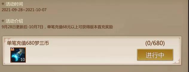 在这一档珍宝中,能够额外再获得30个玉曜玥以及5个月之匙,同时,小伙伴们也要注意了,随着新版本的上线,在10月7日之前,单笔充值680及以上梦三币就能够获得版本首充奖励月之匙*10,购买礼包也是会计算这个任务进度的。