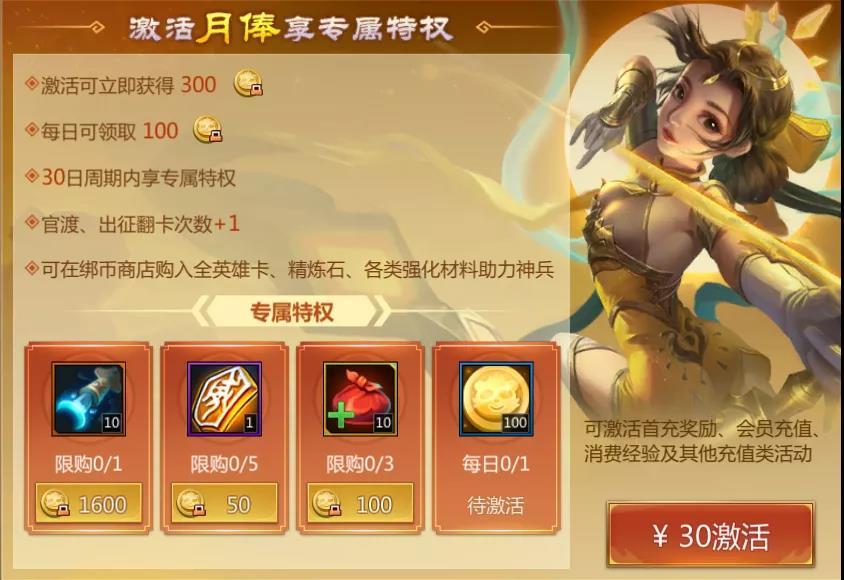 激活立即获得300绑定梦三币,每日可领取100绑定梦三币并且还可以用绑定梦三币购买月之匙等物品。改版后的月俸可以说是非常的划算了。