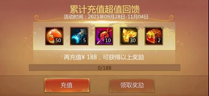 如果大家将必买档1和必买档2的内容全部入手,此时大家的累计充值已经达到了186元,此时可以再充值6元梦三币即可解锁188元档位的珍宝。