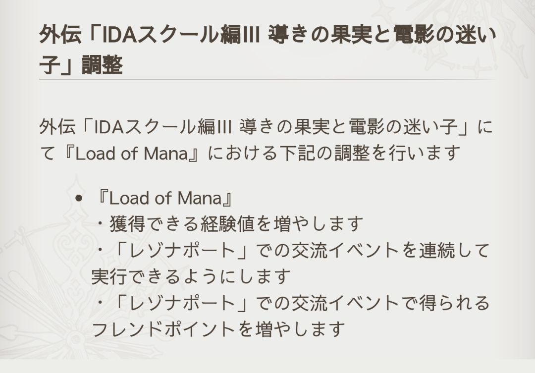 ③外传IDA3即将下修,「Load of Mana」中获得经验及友情点数增加。(预告,不在此次更新范围内)