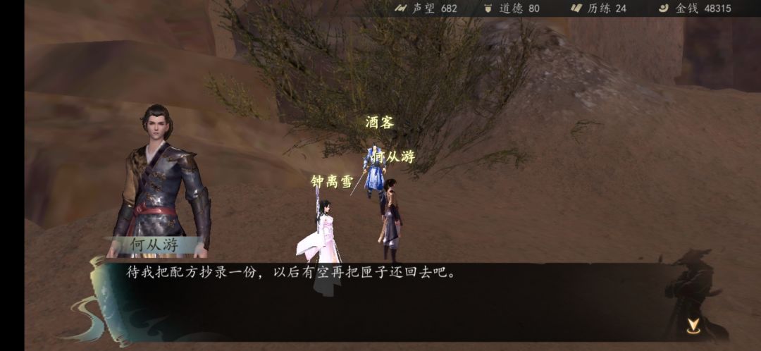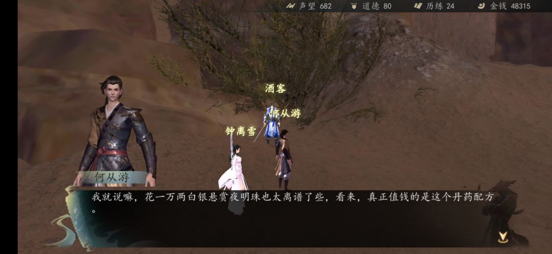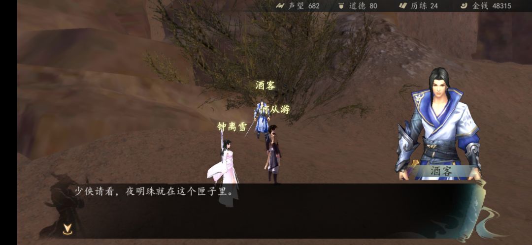 然后去到北城这里,进门会告诉你有一个神色诡异的酒客(没截图,尴尬)和他对话告诉你他有一个夜明珠想要卖给你被他藏在了城外一块石头下面。