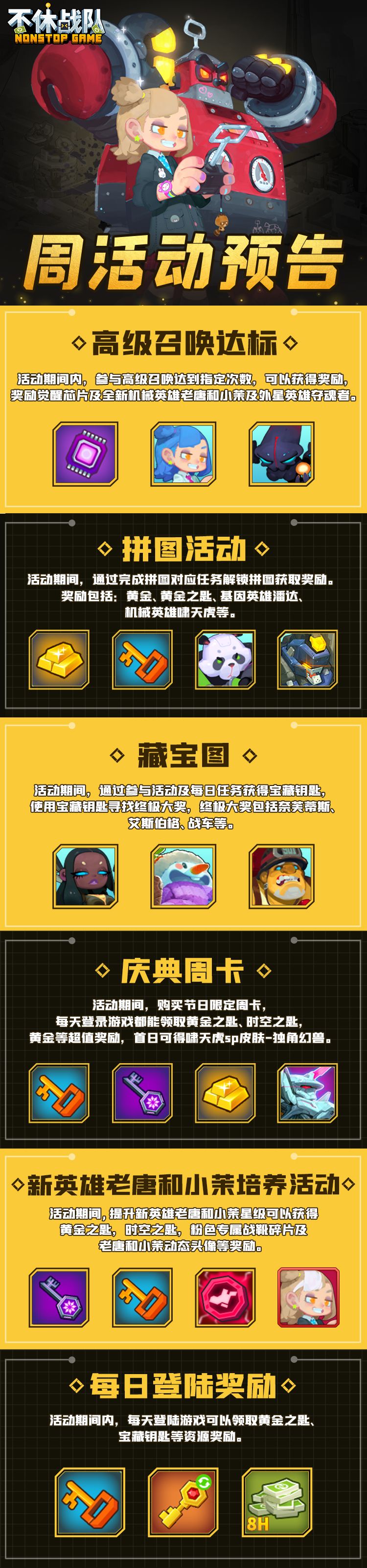 ②拼图活动:活动期间,通过完成拼图对应任务解锁拼图获取奖励。奖励包括:黄金、黄金之匙、基因英雄潘达、机械英雄啸天虎等。