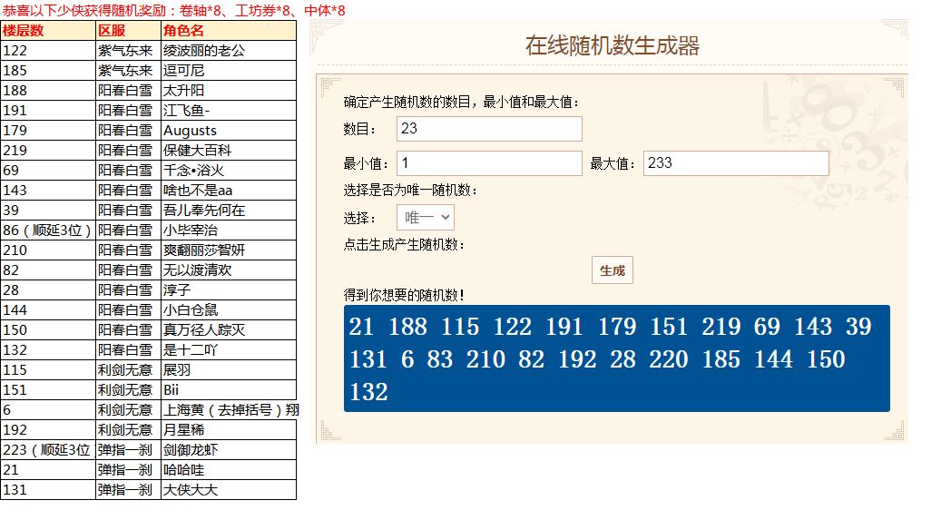 2、活动结束后,将从符合回帖要求的少侠中随机抽取(5+N)名少侠(N=最终楼层数/10),赠送卷轴*8、工坊券*8、中体*8
