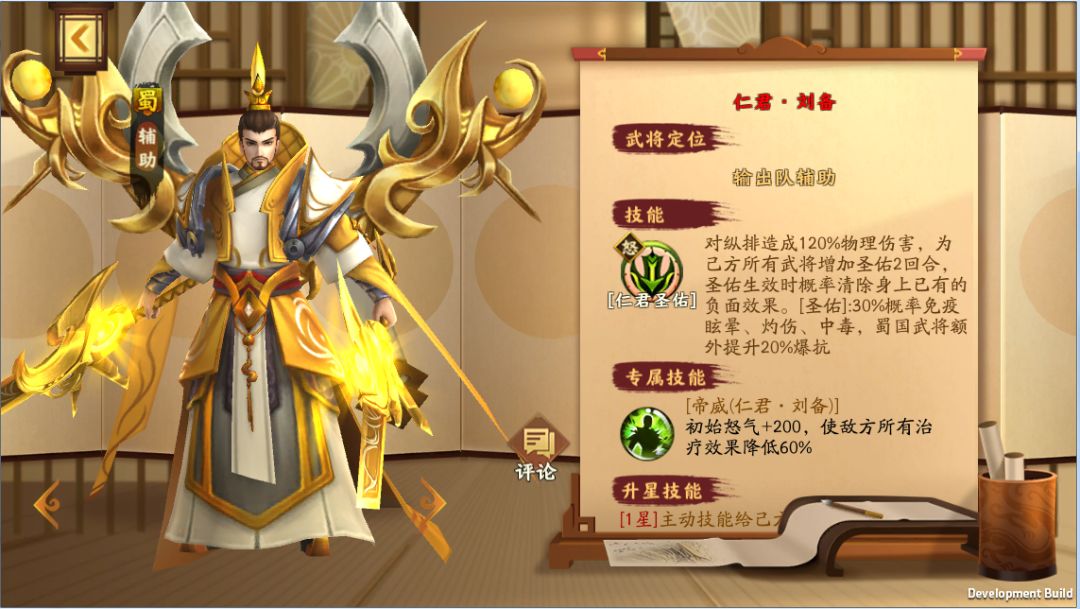 反观仁君·刘备,其更适合山地、丘陵地形作战,并且,英主·孙权的专属战法洪水,正好也克制仁君·刘备的专属战法仁德(一个降低城池内守军兵力,一个提升守军属性,减员VS提升战力,貌似还是减员的伤害更高一些。)。