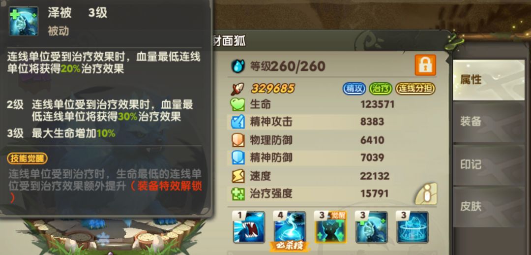 好的,来说下奶妈+豺面狐被动=奶量combo,只要连线单位收到了治疗效果,那么连线中血量最少的单位还能再被小奶一口,可以说是非常实用的被动技能,虽然奶量肯定不如大招,但是有奶总归是一件好事。