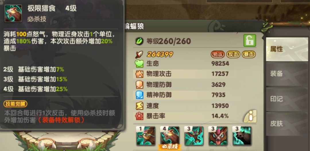 高暴击单体输出,大招【极限猎食】的暴击提升加成搭配【凶恶】的被动暴击概率叠加,单体非常无解,并且蝙蝠狼的反击被动【狼顾】还能和豺面狐连线配合,打出反击,压制敌方血线。