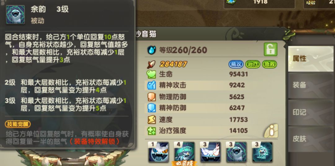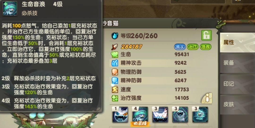 如果局势实在不妙,还有免死金牌【守护之盾】,高速出击,让连线不断、友方不死,这时候在消耗妙音猫的充裕状态,血量直接满上。