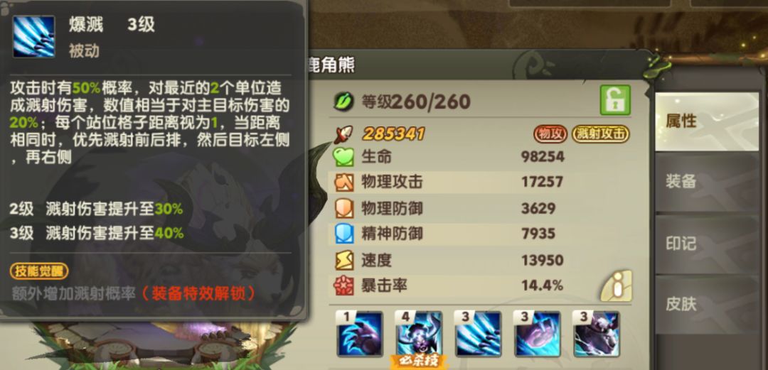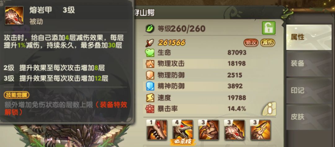 再看下最后这个被动【熔岩甲】:每个回合的攻击能叠加减伤,它越打人伤害越高不说,越打自己还越肉,后期等熔岩甲叠上来了,都不会触发妙音猫的充裕状态来回血,可以说是非常节约资源。