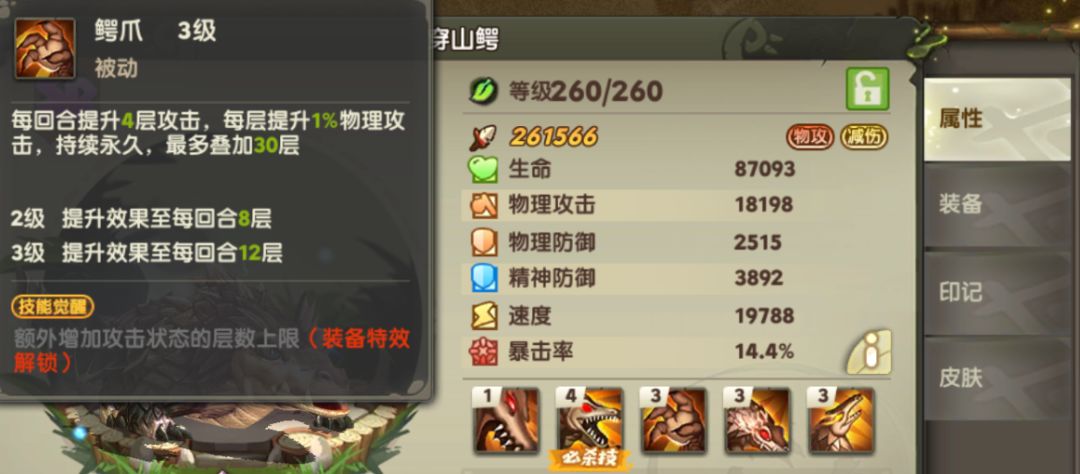 被动【鳄爪】:每个回合都能增加物攻,配合大招打人那是越到后面越顶不住,而刚好,我们四个辅助都是打后期保续航的,最大程度上给了穿山鳄发育的空间。