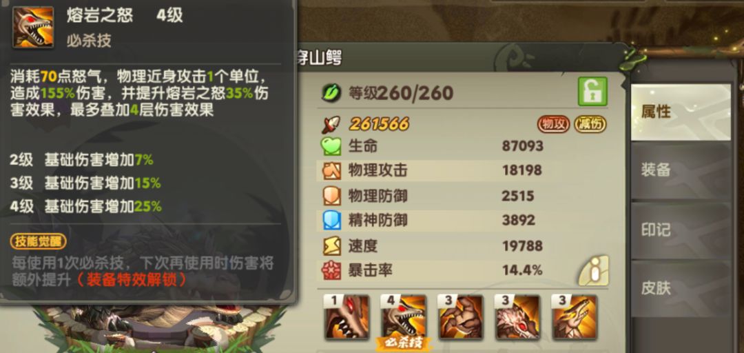 大招【熔岩之怒】怒气消耗仅有70,看下来是不是伤害不如前面几个?注意大招会叠加增伤效果,最高4层,叠起来以后伤害十分恐怖。