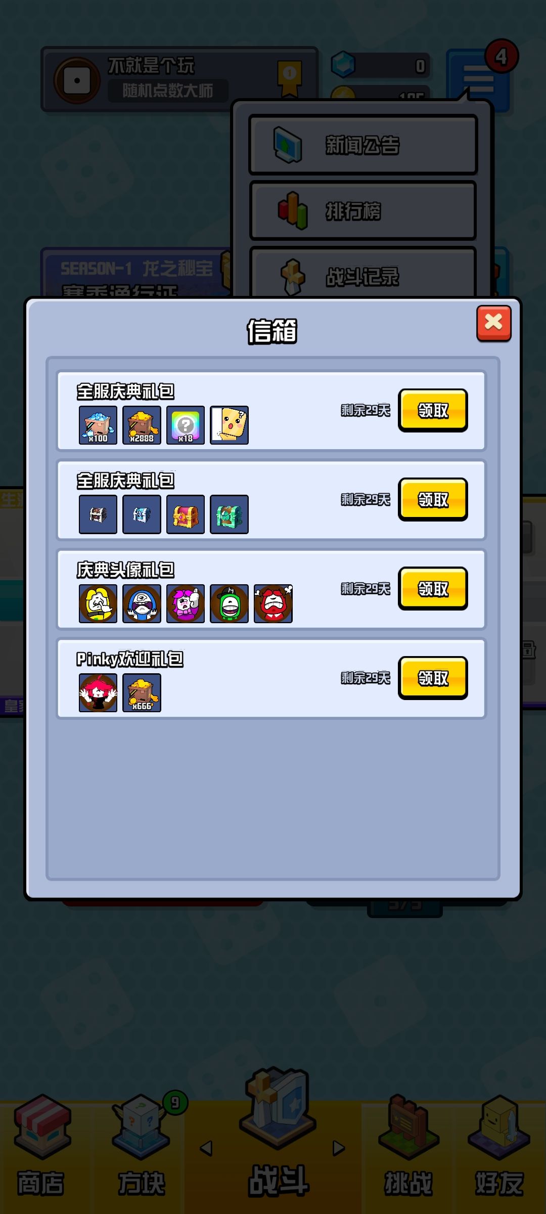 刚刚有时间可以玩,这一上线就领了不少的礼包啊,信箱里面全是送的东西,点领取都点了好一会呢,哈哈