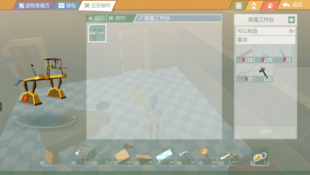最复杂的一步来了(完成这一步,也可以为游戏后期节省不少力气)。制作能量工作台,需要木板x10、钉子x10、烙铁x1、放大镜x1、任意锤子x1。其中,烙铁需要钢杆x1、铜线x1、任意锤子x1制作完成。