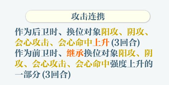 因为每次只能出战3人,且前后排换位CD非常长,因此合理的安排队员及站位,非常重要。通常攻击连携是最佳选择。