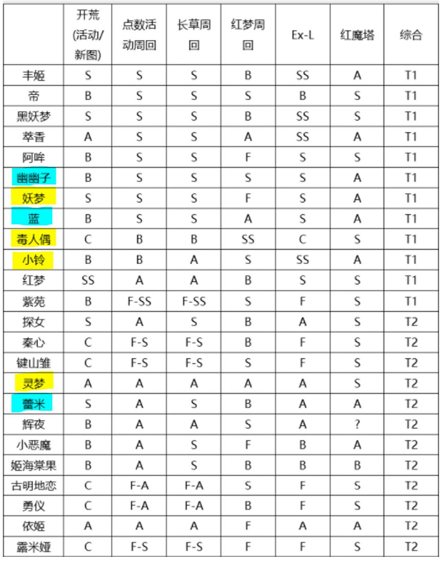 根据日服千里眼,结合未来的活动,目前开荒强度和保值度最高角色是妖梦,其次是梅蒂欣和本居小铃(本居小铃开荒强度一般,但后期活动表现非常好),魔理沙除了打紫妈表现一直都不错,铃仙开荒非常好用,但后期价值一般。灵梦作为主角,一直表现尚可。幽幽子需要等活动,开服暂时无法获得。未来的角色,可以开天眼观察日服或台服节奏榜,总之,开服大部分角色到了后期都沦为八流选手。