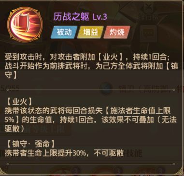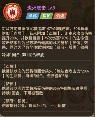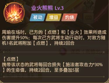 以上就是游戏前期吴国燃烧阵容的基本介绍了,游戏前期【点燃】状态和【业火】状态造成的伤害也是十分可观的,搭配上武将周瑜和武将甘宁可以将两个状态的收益最大化,这也使得吴国燃烧阵容成为游戏内的热门阵容之一,希望这篇攻略能帮助到各位君主。