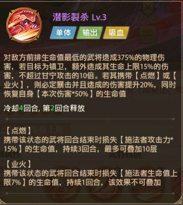 甘宁:在吴国燃烧阵容内主要承担收割和打手作用,所以首先推荐【初级物攻】提高技能伤害量,能更有效的压制敌方武将;其次推荐【初级物追】可以更频的释放技能附加【点燃】状态,或对敌方前排镇卫造成多处的额外伤害,可以更快速的击溃敌方。