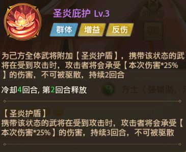 方士大乔(为己方全体武将提供【圣炎护盾】、回复伤害值一定量的生命值)