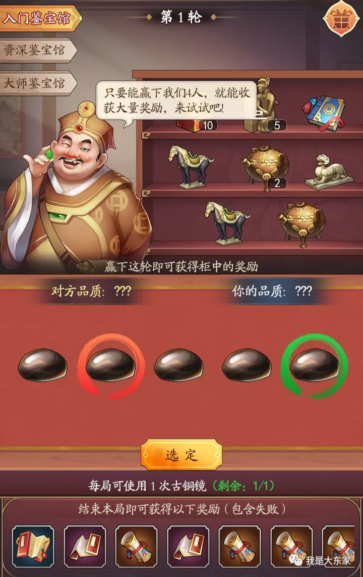 ②鉴宝规则:玩家和对手各自选取一枚未鉴定的玉石,选定后开始鉴定,品质较高的玉石获胜。