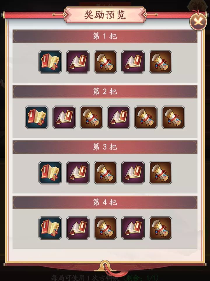 ③场馆等级:活动分为入门、自身、大师三个等级的鉴宝馆,等级越高,奖励越好,需消耗不同等级的鉴宝券开启。