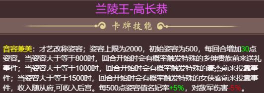 可以看到虽然没有其他皇帝各种加经济得强力BUFF,但是总体来说,「兰陵王」在自由模式中是一张非常适合新手使用的紫色帝卡。