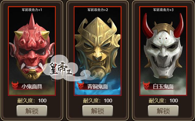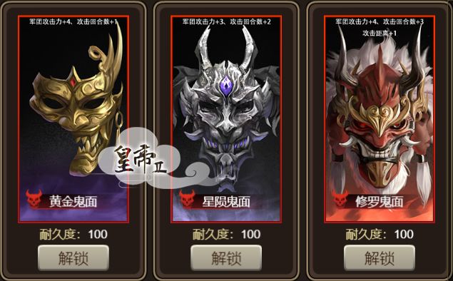 再看他的两个军事技能,首先是【鬼面】技能,面具共有6个,解锁他们需要消耗掉你的【姿容值】,并增加你的威望值。