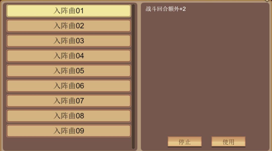 入阵曲1:战斗回合额外+2入阵曲2:战斗胜利威望额外+50