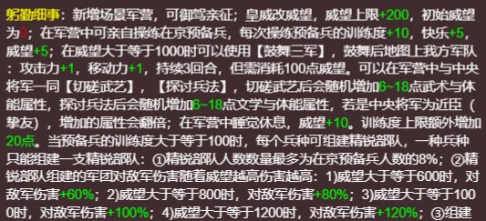 最后值得一提的是他的兵营系统,可以快速增加大量属性,而且最好快速培养一个近臣作为中央将军,这样可以获得双倍属性;比起其他皇帝训练度难升的问题,自己能快速培养兵队的训练度,使很多需要100训练度的兵种能快速建造。