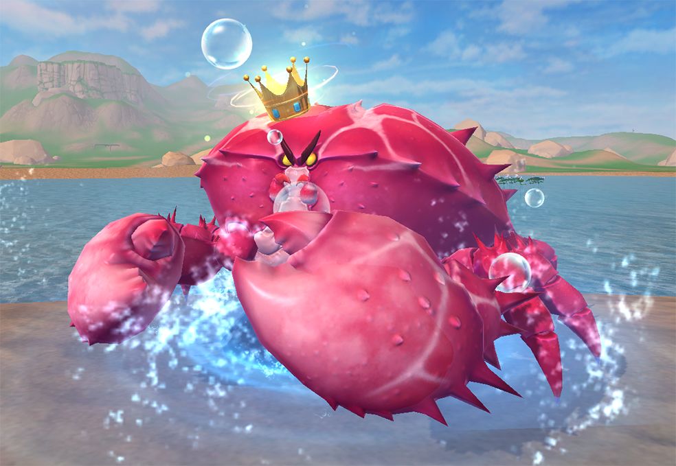 新坐骑沉眠帝王蟹霸气登场!帝王蟹通体粉红,头顶黄色王冠,体型庞大而坚硬,两只巨大的蟹鳌微张,阳光下泛着金属光泽,看起凶猛非常。