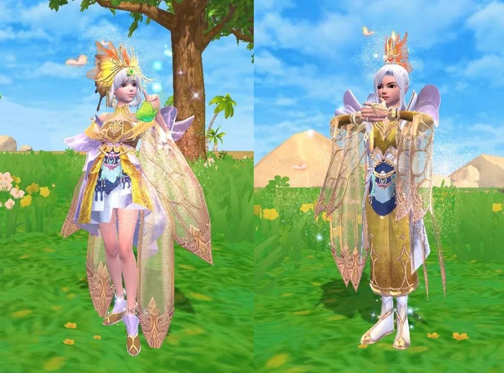 取至臻云蚕之丝,纺诱荧惑蝶之华服,待春至,莺歌蝶舞。金色与淡紫搭配,素雅高贵。女生头戴蝶式金冠,袖摆处像半开的花瓣,下裙花纹繁复精美,后摆星光暗纹。半透金纱,自肩背垂坠于身后,跟随动作自然飘动。男生雪色长发盘起,冠冕端庄,衣裳华重,金边绣纹在阳光下透着的金属光泽。举手投足之间,威严贵气,英姿飒爽,似下凡人间的贵公子。穿戴好新装后,全身星辰闪耀,周围彩蝶纷飞,足下步步生花。