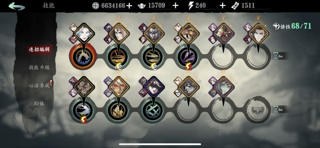 加杀意的技能只带踏剑,杀意其实够,因为白虚空放副卡在放任何技能都有几率触发杀意加1,基本几轮技能后杀意都是满的,白剑放空卡长青只要放技能就能触发,等于全程长青,下链纯属减cd叠buff和挂buff离远点放都行,上链跳起直接按就行但是要把握好距离和打伤害的时间,不要被锤卷死就行,只要你伤害够不需要太多操作。