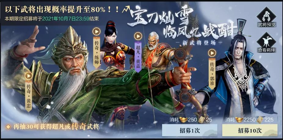 来自三个不同势力的名将齐登场,实在让人激动,那么如何获取这三大名将呢?别着急,全新武将上线的同时,本次更新还将开启大幅提高新武将获得概率的限定招募活动【宝刀灿雪】,以及能免费获取传奇武将黄忠的创新副本【飞火照夜明】。