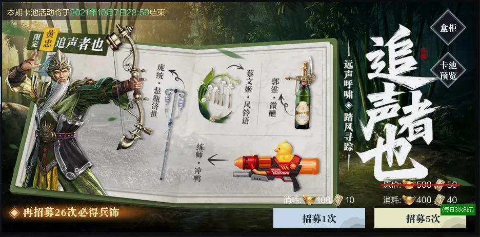 3、限定兵饰仅在限定卡池中可抽取,本次活动有机会获取【限定】黄忠兵饰·追声者也,郭淮兵饰·微醺,练师兵饰·冲鸭,庞统兵饰·悬壶济世,蔡文姬兵饰·风铃语。