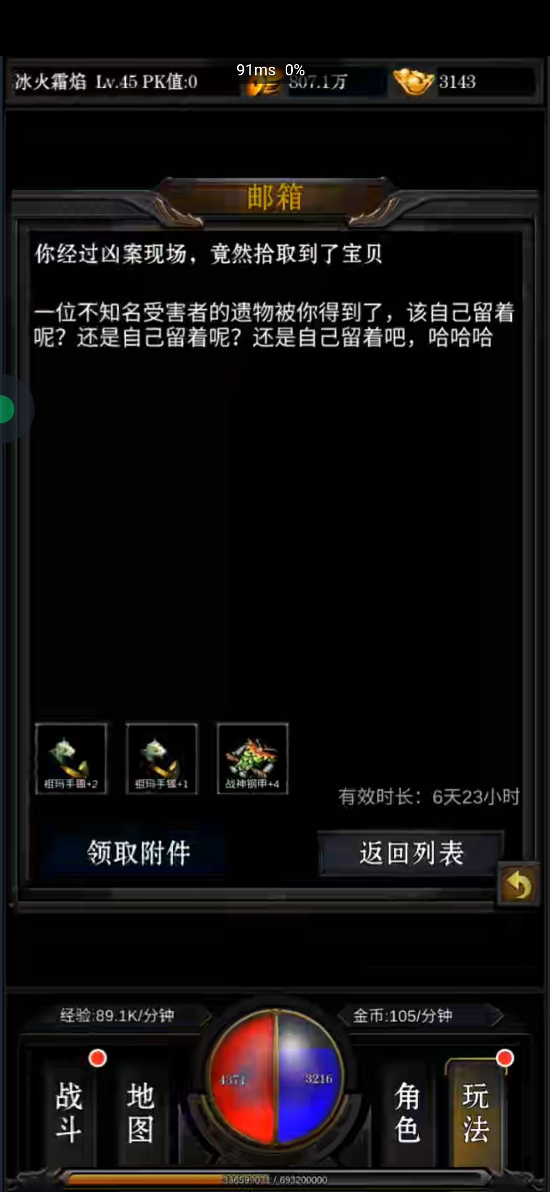 睡前上线看看自己挂了没,收到一个邮件,捡到一堆装备